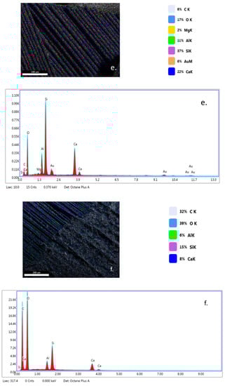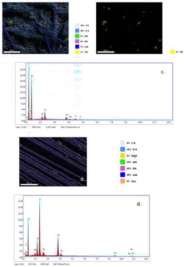 Energy-dispersive X-ray (EDX) patterns for fibersglass covered with PLA/TiO2 hybrid nanofibers: (a) fabric plain woven-type (EWR); (b) fabric mat-type (EMC); (c) fabric one fold edge-type (TEX); (d) fabric plain woven-type (EWR)—after photocatalysis; (e) fabric mat-type (EMC)—after photocatalysis; (f) fabric one fold edge-type (TEX)—after photocatalysis.