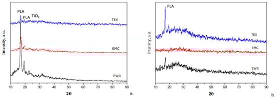 The XRD patterns of fiberglass membranes before and after photocatalysis are shown in Figure 8. The patterns of the membranes before use (Figure 8a) show a strong peak at 16.81° 2θ and one of a lower intensity at 19.23° 2θ, both being attributed to the α PLA crystals. Also, a very low intensity peak appears at 25.35° 2θ, which is attributed to TiO2 in anatase form []. The patterns of the membranes after photocatalysis (Figure 8b) indicate a marked decrease in the intensity of the peaks attributed to α PLA crystals (even their disappearance in the case of the fiberglass mat-type membrane) and the absence of TiO2 in anatase form. These results are consistent with those obtained from SEM–EDX and indicate the degradation of PLA during photocatalysis with the loss of TiO2 photocatalyst.