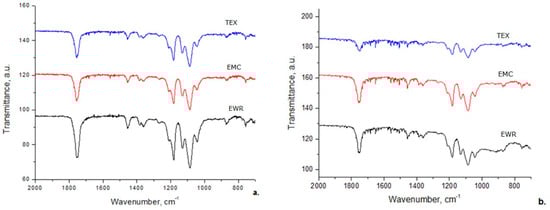 After photocatalytic experiments (Figure 9b) all FT–IR spectra of membranes recorded a decrease of intensity of all FT–IR adsorption bands. In addition, after photocatalytic tests, the adsorption peak from 1755 cm−1 is shifted to 1748 cm−1, demonstrating that many ester groups from membranes were destroyed and some oligomers resulted.