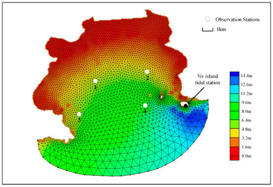 Model domain of Aoshan Bay. White circles represent the positions of velocity observation stations, which is used to measure tidal current velocity. The depth contour represents the lowest astronomical tides.