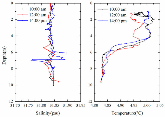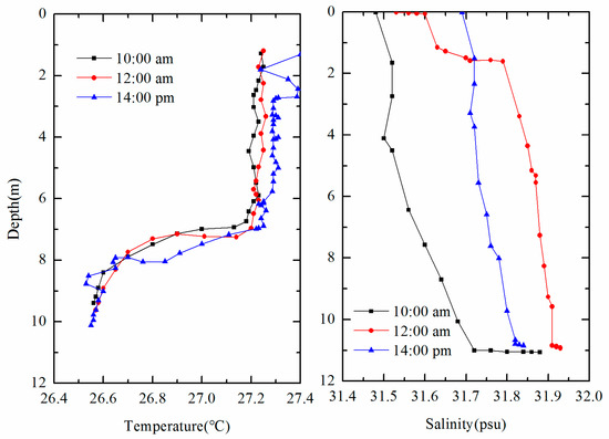 Vertical distribution of salinity and temperature on 22 August at three different times in Aoshan Bay.
