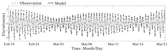Comparisons of model and observed sea elevations at Nv island tidal station.
