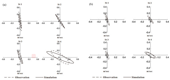 Comparisons of measured and calculated M2 (a) and S2 (b) tidal current ellipses at four stations.