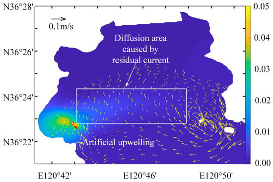 To analyse the diffusion process of upwelling plume in surface water, residual current and tidal current are two major factors. The horizontal distribution of residual current is shown in Figure 7. There are a large residual current circulation and a local circulation at the southwest corner of Aoshan Bay, which are well simulated by numerical simulation. After running artificial upwelling for 10 days in the red circle position, we can see a long tail of artificial upwelling plume, which is marked by the white square in Figure 7. The direction of residual current influence the diffusion direction of upwelling plume, which is northeast. Due to the low velocity of residual current and little volume flow rate of artificial upwelling, the percent of sea surface temperature variation caused by residual current is nearly invisible, which is less than 2% in most part of white square area.