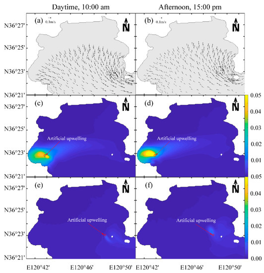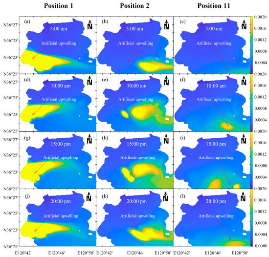 For artificial upwelling position 2, we can find that, after starting artificial upwelling system at 10 am., there is a significant point shown the change of upwelling ratio (Figure 11e). And the upwelling is diluted to open sea by tidal current at 15:00 and 20:00 p.m. (Figure 11h,k). For artificial upwelling position 11, which is closer to open sea and has larger tidal current velocity, the most part of artificial upwelling is transferred to open sea with the ebb tide (Figure 11i,l). Hence, position 11 does not have a good performance in accumulating artificial upwelling plume.