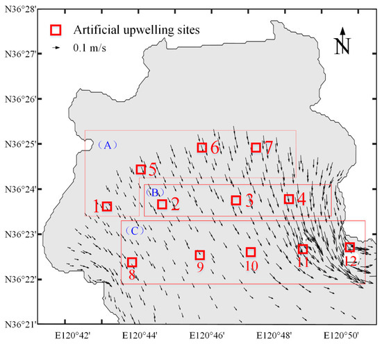 Horizontal distributions of tidal current for ebb tide from the model results (The tidal elevation at the open boundary consisted of four major tidal constituents (M2, S2, K1, and O1) from TPXO in the China Sea with the horizontal resolution of 1/30 degrees.). Red squares represent the positions of artificial upwelling, “1–12” represent the number of artificial upwelling positions. Character “A, B and C” represent three different parts of Aoshan Bay.