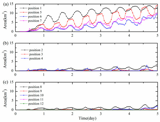The variation of area where Ra is bigger than 0.002 for (a) part A contains 1, 5, 6 and 7 upwelling positions. (b) part B contains 2–4 upwelling positions. (c) part C contains 8–12 upwelling positions.