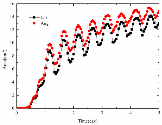 By comparing the variation of area where Ra is bigger than 0.002 at artificial upwelling sites 1 in January and August (Figure 15), we can find that artificial upwelling has better performance in August. The larger temperature difference can maintain more artificial upwelling in surface water. Hence, artificial upwelling is more suitable for hot weather, which has larger temperature difference between bottom and surface water. More details could be seen from Figure 16. The basic variations of effect area have a similar pattern for January and August. However, artificial upwelling in August significantly has larger effect area. In conclusion, artificial upwelling is more suitable for strong-stratification condition. However, even when stratification is weak, artificial upwelling can also work with slightly worse performance.