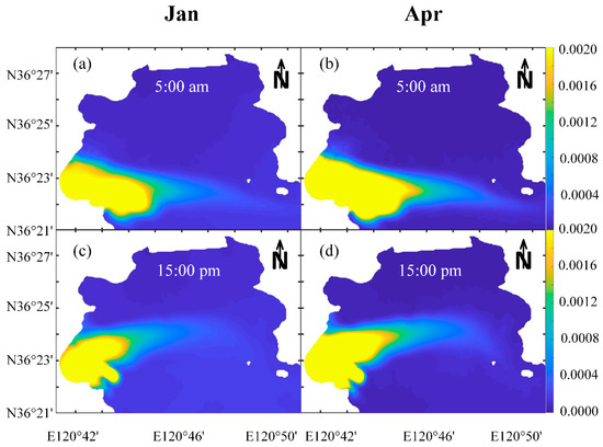 (a,c) represent horizontal distributions of upwelling ratio in surface water at two different times after running artificial upwelling for 5 days at site 1 in January. (b,d) represent horizontal distributions of upwelling ratio in surface water at two different times after running artificial upwelling for 5 days at site 1 in August.