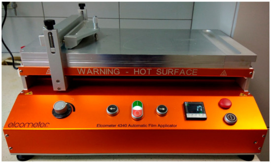 Membranes in the form of flat polymer sheets using rPS polymer, DMF, and SWCNT-OH were prepared by phase inversion using automatic film applicator (Elcometer 4340) (Figure 1). The polymer content in the casting solution varied in the range from 14 to 20 wt.%. Due to the presence of gas bubbles in the solutions, they were subjected to an ultrasonication for about 120 s. Membranes in the form of a polymer film with a casting thickness of 0.15 mm were stored in deionized water for 24 h. The membranes are designated with the symbol rPS X, where X is wt.% share of the polymer contained in the membrane casting solution. Additionally, three membranes with nanotubes were prepared and described as rPS 0.02, rPS 0.05, and rPS 0.1. Numbers represent SWCNT-OH contribution in membrane casting solution. The details about the content of membrane casting solutions are described in Table 2.
