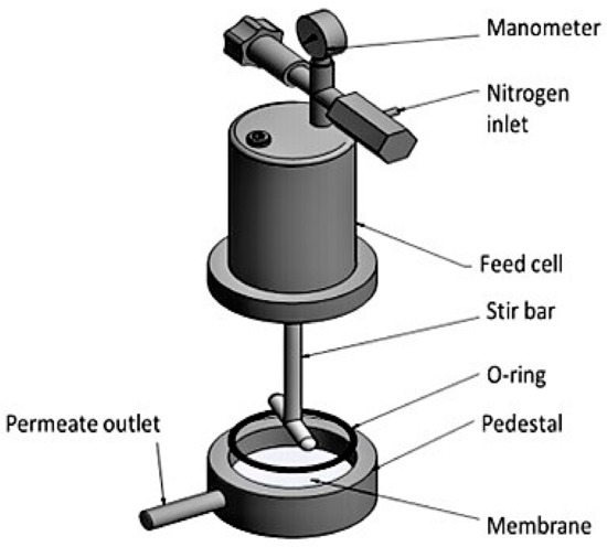 Pressure filtration was conducted in the ultrafiltration setup with a capacity of 400 cm3 and a membrane filtration surface area of 0.003848 m2 in the “dead-end” system at a transmembrane pressure of 0.1 MPa. The construction of ultrafiltration setup cell was presented in Figure 2. Before the actual filtration, the membranes were conditioned with deionized water under the same pressure. The volume of permeate was measured at the same time intervals and then volumetric permeate flux was calculated from the Equation (2):
