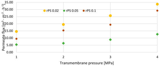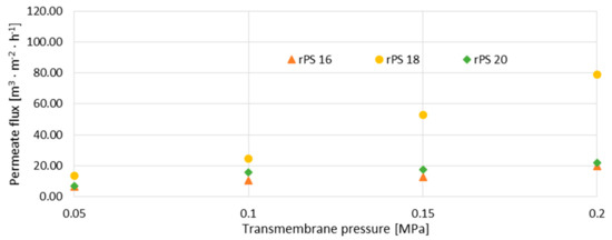 The contact angle of membranes was in the range from 50 to 60° (Table 6). Results should be identical due to the lack of a modifier. These values are comparable for those obtained by other authors and suggest the hydrophilic–hydrophobic properties of the membranes. For comparison, Guruvenket et al. [16] set the contact angle of pure polystyrene of 66°. In addition, membranes made of PES had similar values (60.3–63.3°) [17]. The results obtained in the porosity tests for rPS 18 and rPS 20 membranes assumed a value ranging from about 57 to 62% (Table 6), for this reason, they exhibit a similar permeation characteristic (Figure 3). The rPS 16 membrane had a different porosity, below 40%, which directly affected its low permeability at low pressures from 0.05 to 0.1 MPa. A slight difference in porosity between rPS 18 and 20 rPS membranes did not have a significant impact on the difference in the value of the streams. A slight increase in flux was noted for the rPS 18 membrane due to its lower angle of wettability and hence greater hydrophilicity. For rPS 16, the permeate stream, contrary to common assumptions, was definitely lower than expected. This phenomenon can be explained by the presence of a large number of closed pores, which were opened only when applying a higher pressure above 0.1 MPa. This is visible in Figure 3, where the flow rate for the rPS 18 membrane increases rapidly at pressures of 0.15 and 0.2 MPa. The rPS 14 membrane was not tested due to its excessive permeability, over 100 [m3 · m−2 · h−1]. For this membrane, only surface tests were performed, according to which it has a similar water contact angle and the highest porosity. There is a relationship between porosity and permeability confirmed by Abdel Aal et al. [18], in which the most permeable membrane had the highest porosity.