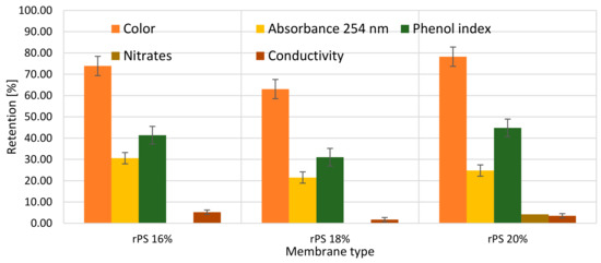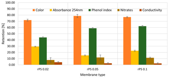 The treatment efficiency of Kłodnica water is shown in Figure 4. Higher reduction degrees of all water quality parameters were observed for membranes with lower permeability. This trend has been repeatedly observed by Tiron et al. [19]. Apart from the reduction of conductivity, rPS 16 membrane had the highest performance for treatment of Kłodnica water. Comparable results were obtained using the rPS 20 membrane, while the rPS 18 membrane had the lowest degree of reduction of all selected parameters. The highest reduction degree was noted for the color, which ranged from 63% to 86%. In the second place, it was a decrease in the absorbance and the phenol index, where the level of reduction ranged from 21% to 44%. The intermediate retention of phenolic compounds (expressed by phenolic index) requires explanation because these substances belong to low molecular weight organic micropollutants and their retention in the ultrafiltration process is usually low. However, sometimes these substances may adsorb or form complexes with other pollutants (e.g., colloids, polymers, natural organic matter) present in surface water. It results in the formation of larger agglomerates, which are retained due to the molecular sieve effect in the UF process [20]. The least effective removal was observed for nitrates, which ranged from 0% for rPS 16% to 3.5% for rPS 20%. The conductivity was reduced by 1.7%, 3.5%, and 5.2% by membranes rPS 18, rPS 20, and rPS 16, respectively. The reduction of nitrates and conductivity was not possible with the use of ultrafiltration membranes because the conductivity is primarily responsible for dissolved salts in the form of ions, which are not retained in the UF process [21]. Similarly for nitrates that are mainly removed in the reverse osmosis process [13].