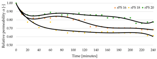 During ultrafiltration of Kłodnica river, flux decline was observed suggesting occurrence of membrane fouling. This unfavorable phenomenon was caused by the macromolecular compounds present in the surface water. To better understand, the intensity of fouling was expressed by relative permeability (Figure 5). The permeate flux decreased over time for each of the virgin membranes. The highest decrease was observed for the rPS 18 membrane with the highest permeate flow. The decrease was about 35% (for 240 min α = 0.65). This membrane should have the highest degree of contaminant retention according to its relative permeability but has the lowest. However, this phenomenon can be explained as follows: this membrane has the lowest water wettability and the highest porosity. The combination of these two features caused that large hydrophobic compounds more readily bind with the surface of the membrane, while high porosity promoted the simultaneous passing of small compounds through the membrane. A similar explanation can be used for the rPS 20 membrane where relative permeability was smaller and decreased only by 24% (for 240 min α = 0.76). This membrane had one of the highest treatment performances. The high porosity of this membrane caused a slower growth of the fouling layer. For the best membrane in contaminant removal, the decrease was about 31% (for 240 min α = 0.69), which corresponds to expectations. A similar tendency was received by Dudziak [27], where the membrane with the lowest relative permeability had the highest removal performance.