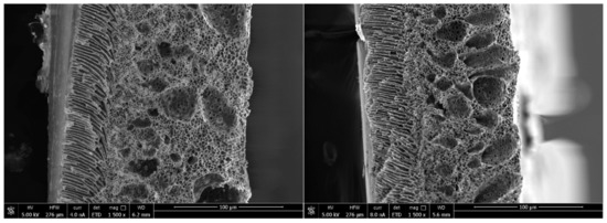 The cross-sectional SEM images of membranes: left—bare rPS 16 membrane, right—modified with nanotubes rPS 16 0.1 membrane.