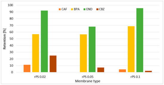 Much more interesting relationships were obtained in micropollutants removal studies presented in Figure 9. A slight or complete lack of caffeine retention was caused by the specific properties of this substance. At the same time, it was the smallest substance with the lowest octanol–water partition (log Kow) coefficient, indicating low hydrophobic property, thus low affinity to adsorption. The same property was also responsible for low CBZ removal rates. Substances with Log Kow below value 2.5 are mostly soluble in water. Substances with log Kow higher than 2.5 can interact with membranes by hydrophobic interactions [32]. This is the reason BPA and END were always removed by all three membranes. In particular, the rPS 0.1 membrane had high removal rates of these two micropollutants (CAF and CBZ) compared to the others. Modified membranes were not able to remove compounds with low log Kow. In many works, polystyrene acts as a phenol adsorbent in technological processes. For example, Siyal et al. [33] achieved removal of 75% to almost 90% of phenols from industrial wastes by the use of modified polystyrene. This demonstrates the high capacity of this polymer to remove these types of compounds as well as the adsorption potential of phenols themselves. BPA is able to create a hydrogen bonding between compound and membrane surface [34]. In addition, the highest degree of adsorption was observed at neutral pH; for Siyal et al. [33], it was pH 7, and for Adamczak et al., it was pH 6.5 [17].