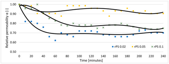 Figure 10 presents relative permeability in time for modified membranes. Comparing this result to unmodified membranes (Figure 5), modified membranes had higher values of relative permeability, indicating better antifouling properties. Among rPS 0.02, rPS 0.1, and rPS 0.05 membranes, the rPS 0.05 membrane had the best resistance to fouling. This membrane had the lowest flow as well as the weakest retention properties. However, it showed the highest stability with a stream decrease of only 10% (for 240 min α = 0.90). The other modified membranes had a decrease of 20% (α = 0.80) and 25% (α = 0.75) for rPS 0.02 and rPS 0.1, respectively. These results also indicate slightly better properties than for unmodified membranes. We can also observe a similar phenomenon as in the first part of the study, where the best retention membrane had the lowest α coefficient [27].