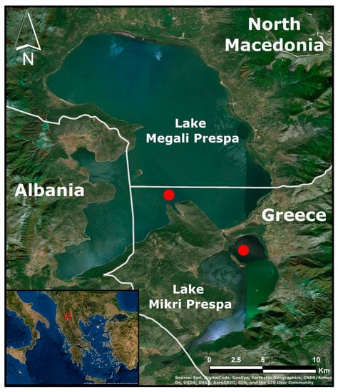 The lakes Mikri Prespa and Megali Prespa are of two the oldest lakes on earth, both with an estimated age of 2–5 million years [19]. These two lakes are European endangered monuments hosting high richness of endemic and internationally important endangered species. The two lakes are also included in the Natura 2000 network that constitutes the cornerstone of the conservation policy of the European Union. Since 1975, Lake Mikri Prespa was also designated as a Ramsar Site. Both lakes are situated at the northwestern part of Greece, SE Europe (Megali Prespa: 40°45′ N, 21°01′ E, Mikri Prespa: 40°46′ N, 21°05′ E) at an altitude of ≈850 m above sea level (Figure 1). The Lake Mikri Prespa is also a transboundary lake between Greece and Albania. The Lake Megali Prespa is located at the southernmost tip of the Alpine biogeographical region of Europe [20], and is shared by three countries: Greece, Albania and North Macedonia.
