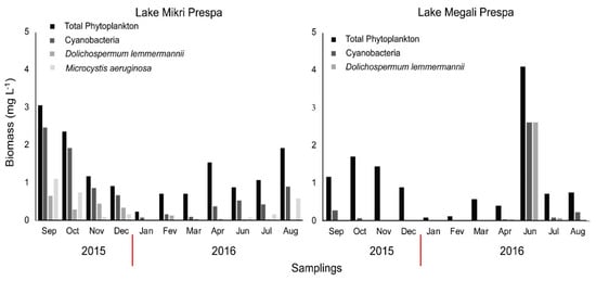 Total phytoplankton biomass, cyanobacterial assemblage biomass and Dolichospermum lemmermannii and Microcystis aeruginosa biomasses in the lakes Mikri and Megali Prespa during the period from September 2015 to August 2016. M. aeruginosa biomass was counted only in the samples of Lake Mikri Prespa.