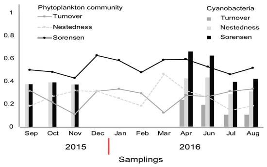 Alpha diversity estimators (i.e., species richness and the Simpson index) for the whole phytoplankton community and for cyanobacteria were calculated with the PAST3 software [28]. To compute beta diversity of the whole phytoplankton community and of the cyanobacteria assemblages in each sampling, we used the “betapart” R package, version 1.5.1 [29]. Beta diversity was portioned into its spatial turnover and nestedness components, following Baselga’s approach [30]. This approach [7,30] suggests that Sorensen pair-wise dissimilarity (bSOR) should be partitioned into two components: spatial turnover in species composition, measured as Simpson pair-wise dissimilarity index (bSIM); and variation in species composition due to nestedness (bNES) measured as the nestedness-fraction of Sorensen pair-wise dissimilarity. The above analyses were run in the R 3.5.3 environment (R core team 2018).