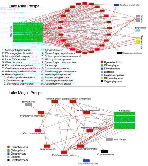 The strong connections between cyanobacterial/phytoplankton species according to MIC correlation coefficients (MIC values corresponding to p-values < 0.01) are visualized in networks (Figure 4). Several negative and positive connections between cyanobacteria and other phytoplankton taxa were observed. The observed links were attributed to Cyanobacteria and Chlorophyta. In particular, the dominant cyanobacteria in Lake Mikri Prespa, M. aeruginosa and D. lemmermannii were negatively connected. In Lake Megali Prespa, D. lemmermannii had negative connections both with the other nostocalean species Dolichospermum viguieri and Aphanizomenon gracile and the oscillatorealean Planktolyngbya limnetica.