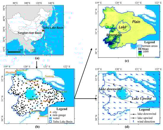 Geography overview of study area and rainfall gauge distribution. (a) Location map of Taihu Lake Basin in China; (b) DEM and terrain sub-areas of Taihu Lake Basin; (c) City and rain gauges distribution in the Taihu Lake Basin; (d) Average wind field distribution in the Taihu Lake Basin in flood season.