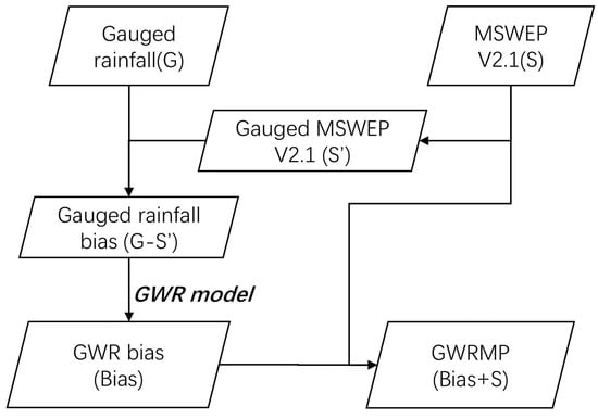 The dataset of surface observational precipitation used to integrate MSWEP V2.1 comes from the global limited rain gauges only. In order to make full use of ground observation precipitation information, the geographically weighted regression model was used to combine MSWEP V2.1 with precipitation of high-density rain gauges to obtain GWR merged precipitation (GWRMP) in the Taihu Lake Basin. Hu Q F et al. firstly proposed the residual-based rainfall merging scheme using geographically weighted regression (GWR) in 2015 [28], then GWR-based merging method has been widely used in the analysis of precipitation fusion [29,30,31,32]. The generation model of GWRMP involves three primary processes: (1) obtaining the rainfall bias at gauges between gauge precipitation and corresponding grid rainfall of MSWEP V2.1; (2) Taking the local characteristics of MSWEP V2.1 as the weight, rainfall bias at gauge is interpolated to get the spatial distribution of rainfall error based on the regression principle; (3) by the inverse operation of the method for the estimation of rainfall bias at the gauge, the bias field generated by GWR was superimposed onto the MSWEP V2.1 field to obtain the GWRMP. The specific calculation formula of each content refers to references 30 and 31. The general framework of GWR-based rainfall merging algorithms is displayed in Figure 2.