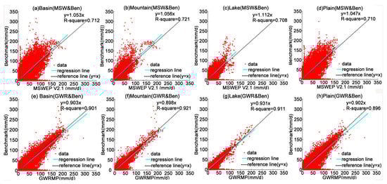 Scatter plot of MSWEP V2.1 and GWRMP corresponding to the benchmark at 0.1° × 0.1°grid scale. (a–d) are respectively the scatter plot of MSWEP V2.1 and benchmark in the whole basin, mountainous area, lake area and plain area; (e–h) are respectively the scatter plot of GWRMP and benchmark in the whole basin, mountainous area, lake area and plain area.