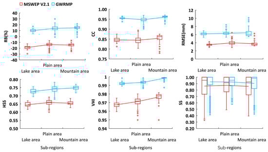 Figure 4 shows a box diagram of MSWEP V2.1 and GWRMP daily precipitation accuracy indicators at the grid scale. Compared with the benchmark, MSWEP V2.1 has certain degree of underestimation of precipitation in the basin (RB > −20%), while GWRMP has a certain degree of overestimation (RB < 20%). The RMSE of GWRMP is overall 2 mm lower than that of MSWEP, both CC and HSS of GWRMP is greater 1 than that of MSWEP, and the VHI of GWRMP is about 0.3 higher than MSWEP. All the indices of time sequence accuracy of each grid reveal that GWRMP has significantly higher accuracy than that of MSWEP V2.1, suggesting that the precipitation of GWRMP has a stronger ability to classify and identify the daily precipitation events than MSWEP V2.1 in the time series variation in the Taihu Lake Basin. Although the structural similarity index SS has a large variation range, the average value corresponding to MSWEP V2.1 and GWRMP is not less than 0.8, and the average value corresponding to GWRMP is as high as 0.9, indicating that both the MSWEP V2.1 and GWRMP are highly consistent with the benchmark precipitation in the daily spatial distribution. The precipitation accuracy of different topographic sub-regions was also measured and analyzed. From an average point of view, the RB, HSS, and VHI showed that there is a slightly lower precipitation accuracy in lake area compared with plain and mountainous area, and CC indicates the accuracy of precipitation in mountain area is slightly better, while RMSE suggest Lake is an area with higher precipitation precision compared with the other sub-regions. Considering the area difference of three sub-regions, i.e., plain area > mountain area > lake area, RMSE and CC may be biased due to the relatively fewer grid samples in the Lake area. It can be reflected from spatial similarity index SS, the similarity of precipitation distribution and benchmark between Lake area and mountain area is slightly lower than that of plain area. Comprehensive to is it can know the accuracy of precipitation estimation of MSWEP, as well as GWRMP, is higher in plain area, followed by mountain area and Lake area. It is difficult to detect the precipitation accurately in mountainous areas, which is a common feature of many global precipitation data. The distribution of relatively sparse and uneven rain gauges may lead to the relatively low consistency between the benchmark and MSWEP V2.1 and GWRMP in the lake region.