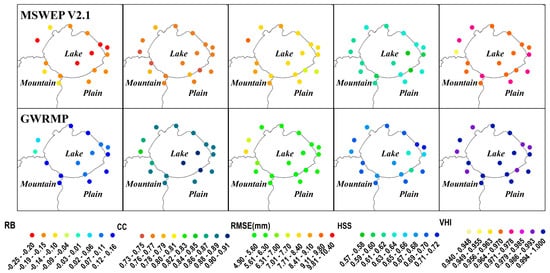 Considering the daily grid precipitation generated by spatial interpolation has certain error as the benchmark in Taihu lake with relatively sparse and uneven rain gauges. With the limited gauged rainfall in the lake and coastal areas as the new benchmark, the MSWEP V2.1 and GWRMP at grid scale corresponding to the rain gauges were extracted to conduct the check on the grid precipitation accuracy at the scale of rain gauges in lake area (Figure 5). After the fusion of the gauged precipitation, the accuracy of GWRMP is significantly improved compared to MSWEP V2.1, the RB is controlled within 16%, the CC is increased to above 0.85, the maximum of RMSE is reduced from 10.4 to 8.4, and the HSS and VHI are as high as 0.7 and 0.99, respectively. All the precision indices reveal that the GWRMP has significantly higher accuracy than MSWEP V2.1 at the gauged scale, which is consistent with the evaluation results at the grid scale. Compared with MSWEP V2.1, GWRMP is closer to the real precipitation and can be used to estimate the precipitation and analyze the spatial distribution in the lake area.