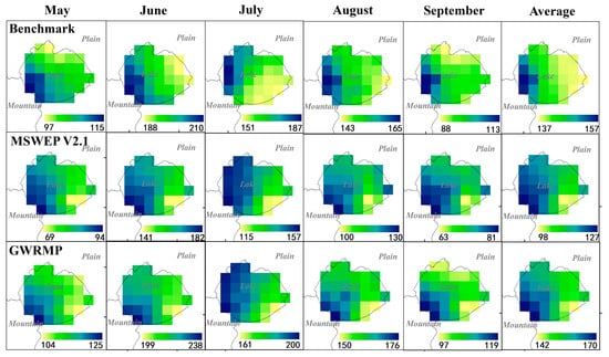 In order to distinguish the characterization capabilities of the benchmark, MSWEP V2.1 and GWRMP in Taihu Lake, the comparative analysis of rainfall and spatial distribution in the lake has been carried out respectively in the flood season (Figure 6 and Table 1). Consistent with the accuracy evaluation results, the precipitation underestimation of MSWEP V2.1 is obvious, while GWRMP is slightly higher than the benchmark. The highest precipitation occurs in June, and the smallest occurs in May and September. In the west of Taihu lake is basically a heavy rainfall area, while there is not much rainfall in the middle and east, and this spatial distribution pattern is likely to cause a high-water level in Taihu Lake, resulting in increasing flood control pressure in Lake area and its downstream. GWR integrates the information on precipitation spatial distribution at rain gauges and of MSWEP V2.1, effectively reducing the rainfall difference with the benchmark on the one hand, and allowing identification of strong precipitation spatial distribution, on the other hand, characterized by more precipitation in the southwest of Taihu Lake and less precipitation in the northeast. The precipitation in July is significantly less in the east and more in the west.