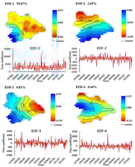 Because GWRMP has a stronger ability to characterize the time-space distribution of precipitation than MSWEP, gridded GWRMP was used to conduct the analysis of the spatial distribution and main influencing factors of precipitation in Taihu Lake Basin. The EOF analysis and the North test (Figure 7) of the monthly GWRMP at 0.1° × 0.1° grid scale in the flooding season from 1979 to 2016 were carried out. The results show that at the 0.95 significance level, the variance contribution rate of the first EOF mode (referred to as EOF-1) is 95%, representing the main type of spatial distribution of precipitation—high precipitation value is distributed in the southwest of the Taihu Lake Basin and low precipitation value is distributed in the eastern plain region (upwind area of Taihu Lake). The time coefficient over the years shows precipitation in September 1999 is the most typical type of EOF-1. The variance contribution rate of the second mode EOF (EOF-2) is 2.69%, and the precipitation is characterized by a typical band-shaped distribution, that is to say, the precipitation gradually increases or decreases from the south to the north. The variance contribution rate of the third and fourth mode EOF (EOF-3, EOF-4) is less than 1%. EOF-3 also shows a band-shaped distribution of precipitation, but the rainfall gradually increases or decreases from east to west. The precipitation of EOF-4 is semi-circularly distributed from west to east, the precipitation distribution in the east, south and north outskirts is opposite to that in the central western region.