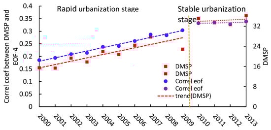 Table 2 shows the Pearson correlation coefficient between four kinds of precipitation distribution of EOF and potential influencing factors at 0.1° × 0.1° grid scale and the t-test results. The correlation coefficient between the precipitation of EOF-1 and DEM is the highest (0.64), indicating that topography is the dominant influence factor determining the main spatial distribution pattern of precipitation in the entire basin. The precipitation of EOF-2 and EOF-3 have the highest correlation with latitude and longitude respectively, and both their correlation coefficients are above 0.90, it can be verified that EOF-2 and EOF-3 are typical latitude zonal and longitude zonal precipitation distribution pattern respectively. The correlation coefficient between the precipitation of EOF-4 and the four influencing factors is not high, relatively speaking, the correlation with DMSP is the highest and passed the t test. The consistency of the spatial correlation coefficient between DMSP and the precipitation of EOF-4 in time series is further diagnosed as shown in Figure 8. The period from 2000 to 2010 witnessed the rapid urbanization of the entire basin (DMSP shows a significant incremental change), and although the spatial correlation coefficient between DMSP and the precipitation of EOF-4 is low, its variation trend is basically same as DMSP. After 2010, the Taihu Lake Basin has entered a stage of stable urbanization (the DMSP increases slowly), and the spatial correlation coefficient between DMSP and the precipitation of EOF-4 also increases slowly. Overall, EOF-4 is the spatial distribution pattern of precipitation under the leading role of urbanization.