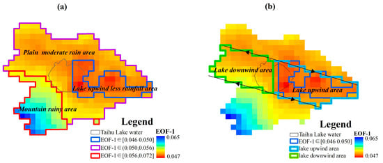 Large-scale lakes have a certain influence on the temporal and spatial distribution of precipitation [2,3]. According to the scope of the lake region, and the distribution of the dominant wind direction in the summer in the study area, with the vertical centerline of the lake as the boundary, the lake region is divided into the upwind and downwind areas (Figure 9b). The precipitation of EOF-1 has a significant difference in the upwind and downwind areas. According to statistics, the precipitation in the upwind area is 8.31% less than that in the downwind area. Figure 9b shows that the area with EOF-1 < 0.05 is located in the lake upwind area, Considering the division by EOF-1 value, it is an area with low precipitation value. The precipitation distribution pattern of upwind and downwind areas is consistent with lake-effect precipitation.