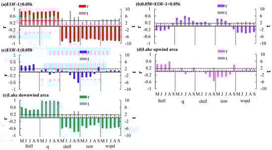 Correlation analysis between precipitation distribution of EOF-1 in different divisions and annual average monthly climate factors (lhtfl, q, shtfl, tem and wspd) at 0.25° × 0.25° grid scale in flood season. (a) Correlation analysis between the divisions of EOF-1 ≥ 0.056 and climate factors in corresponding areas; (b) Correlation analysis between the divisions of 0.050 < EOF-1 < 0.056 and climate factors in corresponding areas; (c) Correlation analysis between the divisions of EOF-1 < 0.05 and climate factors in corresponding areas; (d) Correlation analysis between the divisions of EOF-1 in the upwind area and climate factors in corresponding areas; (e) Correlation analysis between the divisions of EOF-1 in the downwind area and climate factors in corresponding areas.