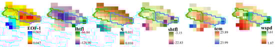 Correlation analysis (Figure 10a) shows that the precipitation of mountain rainy area in the southwest is directly proportional to and , but inversely proportional to , tem and wspd. Since ERA5 data define the heat released from the surface as negative value, both and in flood season are mainly negative values, it can be known that rainfall in mountain rainy area is directly proportional to , but inversely proportional to . Combining with the multi-year average spatial distribution of climatic factors in the flood season (Figure 11), it can be found that in the southwest mountain rainy area, the and q are high, is medium, tem and wspd are low. The condition of higher DEM, smaller horizontal wind speed, stronger convection (high ), larger high-altitude specific humidity , and cooler surface temperature in mountain area, provides an advantage of precipitation, resulting in a heavier rainfall than that in other subareas. The correlation between the climatic factors and the precipitation distribution in the lake downwind area is relatively consistent with that in the southwest mountainous area, but the consistency in the upwind area is poor.