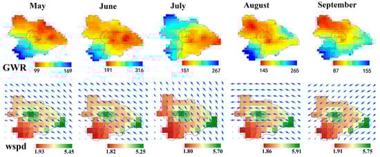 Spatial distribution of monthly precipitation and wind speed in flood season in the Taihu Lake Basin.