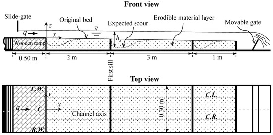 The flume bottom downstream of the wooden ramp and between the sills is covered with an erodible bed material layer, consisting of almost uniform sand particles with a mean average size, d50, of 1.8 mm and density of 2650 kg/m3 (see Ben Meftah and Mossa [3] for more information). Along the experimental area, the sand layer was leveled respecting the maximum sill heights and that of the upstream wooden ramp, forming the original bed of the channel with a slope S0 (Figure 1).