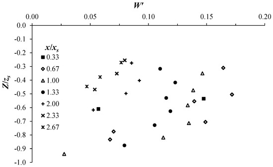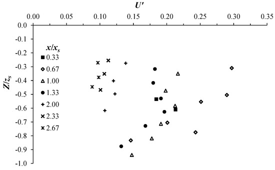 To get further information on the scouring process, in Figure 3 we plot the streamwise turbulence intensity, U′, as a function of the normalized vertical coordinate Z/zs. Herein, U′ was defined as the ratio of the standard deviation of the streamwise flow-velocity component fluctuations to the average velocity, Uc, measured over the sill-crest, Z is the vertical position from the original bed profile (solid line in Figure 2) at a given downstream position x. The vertical U′-profiles correspond to different downstream positions x/xs = 0.33, 0.67, 1.00, 1.33, 2.00, 2.33, and 2.67, where xs is the x-position from the grade-control structure (sill) at which the scour attains its maximum depth. Note that, due to the flow symmetry, the spanwise velocity, V, is theoretically expected to be null and therefore it has not any physical significance in this plane.