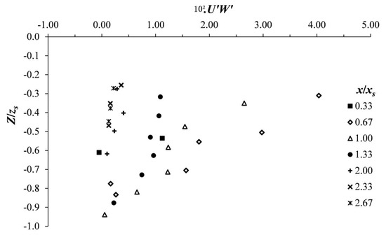 Vertical profiles of normalized Reynolds shear stress, U′W′, in scour hole and at different downstream positions x/xs along the plane of flow symmetry (y = 0).
