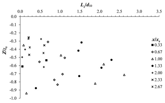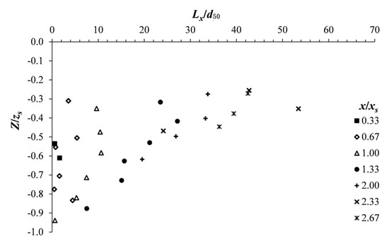 Figure 7 and Figure 8 depict the vertical profiles of the integral length scales Lx and Lz, respectively, normalized by the mean average diameter of sediments, d50, at different downstream positions x/xs. The processed data and the downstream positions x/xs are the same as those covered in the previous sections. Herein, Lx is the integral length scale in the x-direction and Lz in the z-direction, calculated by means of the variables (U, Tx) and (W, Tz), respectively.