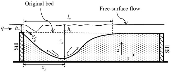 In this section we focus on the scaling of the maximum scour depth at the equilibrium condition, derived from the phenomenological theory of turbulence. At equilibrium, the scour hole between two consecutive bed sills is shown schematically in Figure 10. The scour hole is caused by the effect of a sort of an entering jet flow of both initial thickness and initial velocity comparable, respectively, to the flow depth, hc, and its corresponding velocity, Uc, over the sill. In Figure 10, q is the unit water discharge, ls is the equilibrium scour length and ht is the tailwater depth at the position xs of the maximum scour depth at equilibrium, defined as the vertical distance between the initial bed profile and the free-surface flow (at xs the total flow depth is hs = zs + ht). The effective parameter of the scour hole, illustrated in Figure 10, can be expressed as follows: