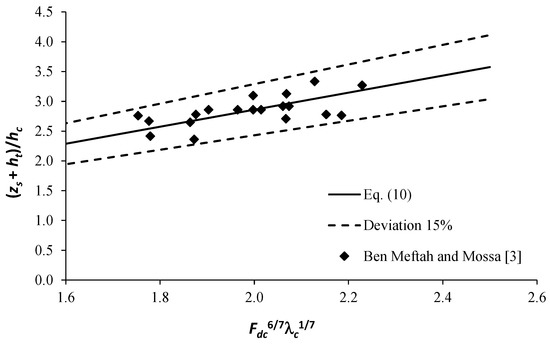 It should be mentioned here that the scaling law of the maximum scour depth at equilibrium, investigated applying the phenomenological theory of turbulence, as shown by Equation (9), is explicitly expressed as a function of only the dimensionless parameters Fdc and λ, also appearing in Equation (5) through dimensional analysis. It should be noted that, contrary to dimensional analysis, the application of the phenomenological theory of turbulence establishes a unique and complete (with defined exponents) relationship between some of the characteristic variables of the scour hole. Since the flow is fully turbulent within the scour hole and the bed sediment is characterized by a relative roughness in the range of 10−4 < λc <10−1 [30], the scaling law is validated for σ = −5/3, in the energy inertial subrange, and thus Fdc(4/(3−σ)λc(−(1+σ)/(3−σ) = Fdc(6/7) λc(1/7). In order to experimentally evaluate the validity of this scaling law, shown in Equation (9), in Figure 11 we plot measured values of (zs + ht)/hc as a function of Fdc(6/7)λc(1/7). The experimental data used for this scope are those illustrated in Table 1, acquired by Ben Meftah and Mossa [3].