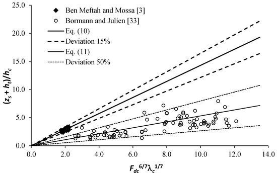 To give more validity to this approach, in addition to the data obtained by Ben Meftah and Mossa [3], in Figure 12 we also plot data previously obtained by Bormann and Julien [4]. The scour data of Bormann and Julien [4] were collected downstream of a grade control structure of different face slopes (18°, 45°, and 90° with respect to the horizontal) in a sand-bed channel of d50 equal to 0.3 mm and 0.45 mm. Due to the complexity of the phenomenon and the wide variety of conditions (including different characteristics of the sediment particles, different geometries of the grade control structure, and different entering jet typologies), the data by Bormann and Julien [4], plotted according to the scaling law of Equation (9), show more scattering than those by Ben Meftah and Mossa [3]. As compared to previous studies [4,33], when data were fitted by other scaling laws, the scaling law of Equation (9) predicts with more accuracy the maximum equilibrium scour depth, as shown by the 50%-deviation from the best fit line of Equation (11). In fact, the normalized scour depth (zs + ht)/hc by Bormann and Julien [4] shows an overall increasing trend as a function of Fdc(6/7)λc(1/7). A linear regression analysis of these data leads to the following expression for predicting the equilibrium scour depth at grade control structures (under Bormann and Julien’s [4] conditions):