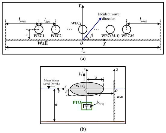 Regarding the coefficients , the PTO mechanism for a th WEC of the array is modeled as a linear damping system (Figure 1b), with damping coefficient , actuated from the heave motion of the corresponding WEC. Consequently, in Equation (9), for , while for .