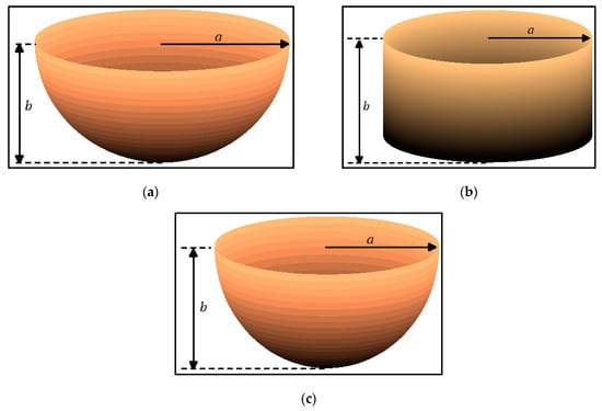 Schematic representation of the wetted surfaces of the WECs’ geometries: (a) Oblate spheroid, (b) cylinder, and (c) hemisphere.