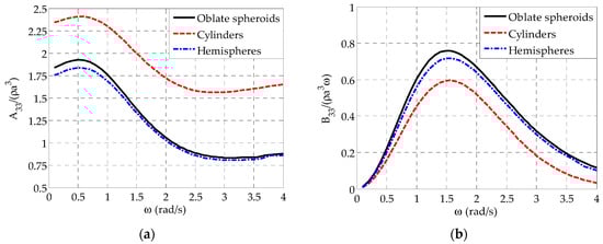 Initially, relevant results are compared with those corresponding to arrays of semi-immersed cylindrical and hemisphere-shaped WECs (Figure 2) in order to demonstrate the enhanced absorption ability of the aforementioned array. Aiming at comparing WECs that have the same , irrespectively of their geometry, the geometrical characteristics of the cylindrical and the hemisphere-shaped WECs have been defined, so that = 2.4 rad/s for both geometries, as in the case of the oblate spheroidal WECs. These characteristics along with the corresponding values are shown in Table 1, where the notations of Figure 2 are taken into account. For both the cylindrical and the hemisphere-shaped WECs, the values of Table 1, equal to , have been obtained from the hydrodynamic analysis of the corresponding isolated body. This, in turn, leads to the consideration of different values among the examined geometries, due to the existence of different hydrodynamic properties (Figure 3).