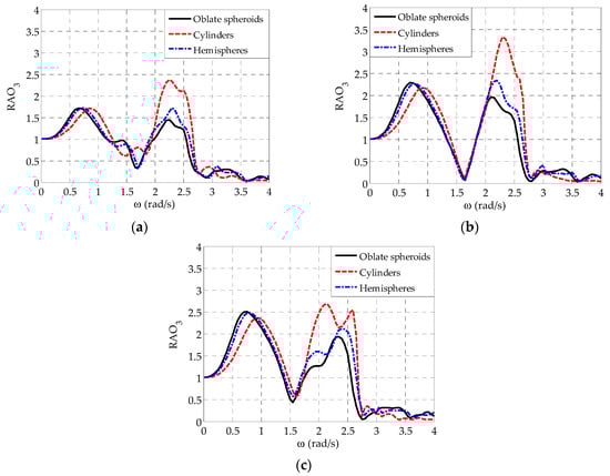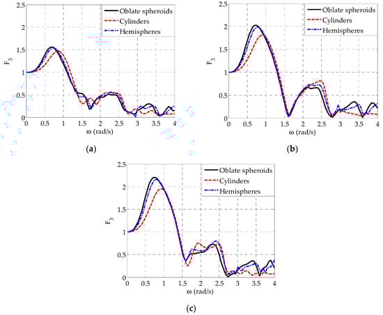 Figure 5 shows the comparison of between the three examined WEC geometries. Again, the results correspond to arrays placed in front of a wall with , while similar conclusions can be drawn for the case of . Irrespectively of the WECs’ geometry and the position of the WEC within the array, follows, in general, the variation pattern of the heave exciting forces which is characterized by the occurrence of two distinctive peaks; one at rad/s rad/s as a result of the existence of the peaks in in the concerned frequency range (Figure 4) and a second peak at rad/s rad/s attributed to resonance phenomena. Moreover, a local minimum is observed at rad/s rad/s, in absolute accordance with the variation pattern of the heave exciting forces (Figure 4). Except at rad/s rad/s, the deployment of hemisphere-shaped WECs within the array does not lead to substantial differences of as compared with the case of the oblate spheroidal WECs. In the concerned frequency range, where resonance phenomena occur, the consideration of a smaller value for the hemispheres (Table 1) has a more pronounced effect on , leading, therefore, to slightly larger values for as compared with those of the oblate spheroids. In a similar manner, the utilization of an even smaller value for the examined cylindrical WECs (Table 1) leads to a significant increase of at rad/s rad/s in the case of WECj, and as compared with the corresponding oblate spheroidal and the hemisphere-shaped WECs. The same holds for WEC3 (Figure 5c) at rad/s rad/s, except at rad/s, where of WEC3 shows a local minimum in absolute accordance with the corresponding variation of the heave exciting force (Figure 4c). Finally, for all cylindrical WECs, the existence of different values at specific frequency ranges (e.g., at rad/s rad/s, Figure 4) as compared with the rest examined WEC geometries leads also to different values at these frequency ranges.