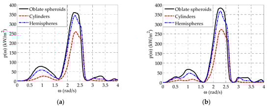 As far as the absorbed mean power is concerned, Figure 6 shows the comparison of among the three examined five-body arrays. For both and and for all three arrays, the variation pattern of is characterized by the existence of a first (local) peak at rad/s rad/s and a second (global) peak at rad/s rad/s, in accordance with the variation of , as previously discussed for the case of . Moreover, local minima of occur at specific values as a result of the relevant substantial decrease of . Compared to the cylindrical WECs, the deployment of either the hemisphere-shaped or the oblate spheroidal WECs greatly improves the power absorption ability of the array, since for the latter WEC geometries significantly larger peak values occur, and, additionally, for rad/s the frequency range, where adequate amount of power is absorbed, becomes wider. All the above are attributed to the consideration of a quite smaller value in the case of the cylindrical WECs (Table 1), as a result of their intrinsic hydrodynamic characteristics. Therefore, although this value results in a significant increase of at the frequency range where resonance phenomena occur (Figure 5), it reduces remarkably the power absorption ability of the array. Following a similar rationale, the deployment of hemisphere-shaped WECs within the array leads to slightly smaller peak values as compared with the oblate spheroidal WECs. Consequently, the oblate spheroidal WECs can be considered to have the best power absorption ability among all the three examined WEC geometries.
