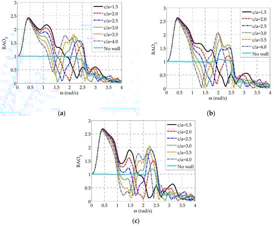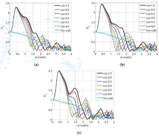 Figure 8 shows the effect of on for all the oblate spheroidal WECs. In this figure, results corresponding to the isolated array are also included to demonstrate more clearly the effect of the presence of the wall on. In the case of and for WECj, , and (Figure 8a,b), the variation pattern of is quite intense and it is characterized by three distinctive peaks. The first one (global maximum) and the third one occur at rad/s and rad/s, respectively, as a result of the relevant maximum values (Figure 7), while the second peak is observed at rad/s and it is related to resonance phenomena. Moreover, a characteristic local minimum, following the preceding rapid decrease of , occurs at rad/s, in absolute accordance with the variation of the heave exciting forces (Figure 7). A similar variation pattern is observed for all examined values. However, by successively increasing up to , the aforementioned local minimum and resonance-related peak of are successively shifted at slightly smaller frequencies as compared with the case of , while the values of the latter peaks are increased substantially. Same conclusions can be drawn when is further increased up to; nevertheless, the placement of the WECs at one of the two largest examined distances from the wall does not introduce any significant differences in the peak values of at rad/s rad/s as compared with . It is also worthwhile to note that at rad/s rad/s the increase of leads to a smooth reduction of values, while only the curve of has a distinctive third peak at very high frequencies (i.e., at ) as in the case of . All the above are in absolute accordance with the results of Figure 7. Finally, with regard to WEC3, which is situated in the middle of the array (Figure 8c), conclusions similar to the case of WECj, , and can be drawn. However, for all values examined, obtains one more distinctive peak at rad/s.